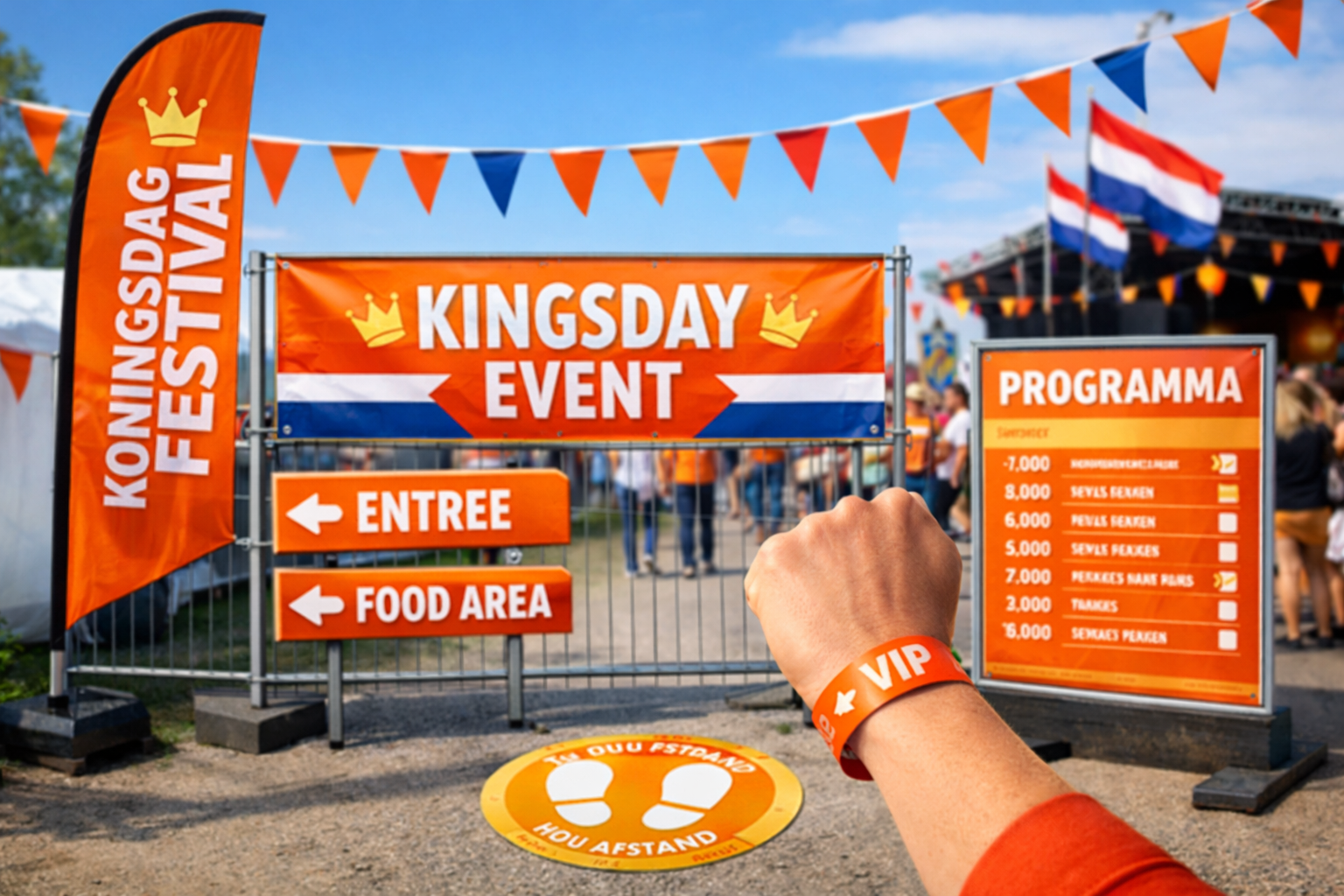 Van opvallende vlaggen en spandoeken tot bewegwijzering en polsbandjes – met de juiste print & sign producten maak je jouw Koningsdag evenement professioneel en overzichtelijk.