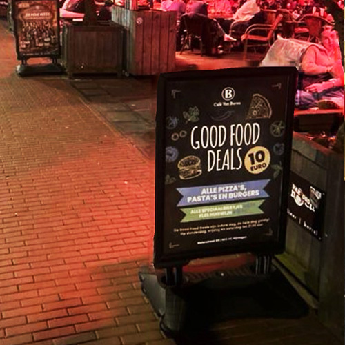 Vanuit marketingoogpunt zijn stoepborden zeer flexibel inzetbaar. Je kunt werken met meerdere uitingen (wisselbare posters of prints), seizoenswijzigingen, specials of actuele boodschappen. Dat betekent dat je je communicatie snel kunt aanpassen aan wat op dat moment relevant is — zonder nieuwe hardware te hoeven kopen.